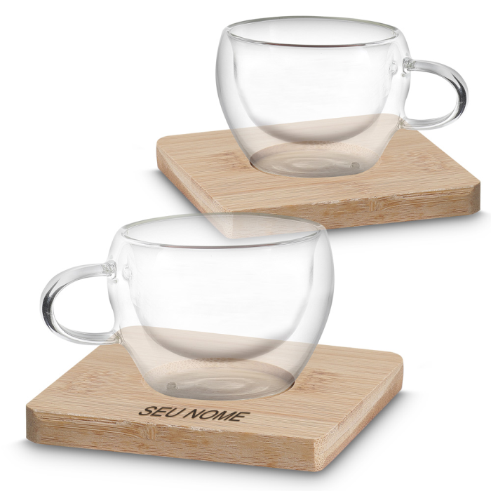 Conjunto com 2 xícaras de vidro borossilicato com parede dupla e capacidade de até 60ml.