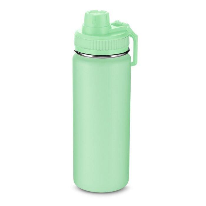Garrafa térmica em aço inox com parede dupla isolada a vácuo com capacidade de 960ml. Alça plástica em formato de mosquetão para transporte, bico rosqueável para fácil acesso e tampa rosqueável com anel de silicone, com pintura a pó.